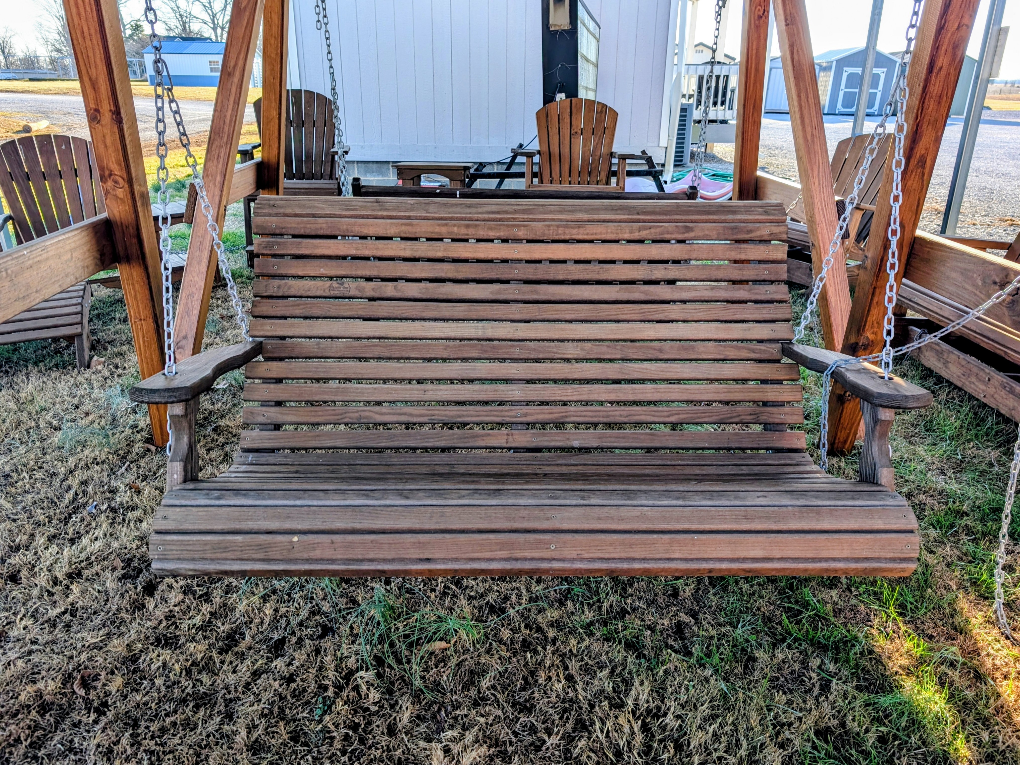 a wood stained and sealed bench being held up by chains in the grass