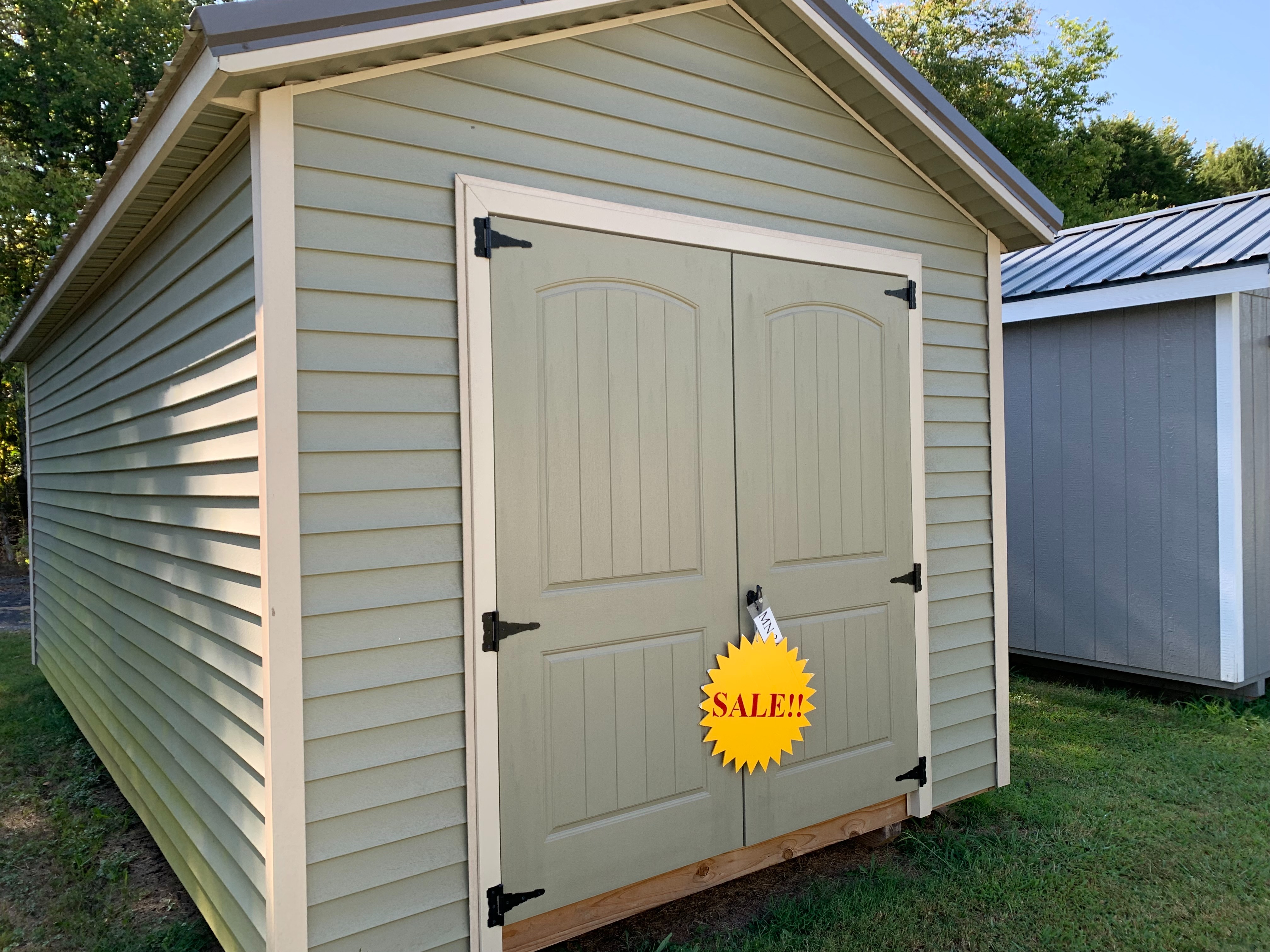 10x20 vinyl shed. Color is cypress, peral trim with charcol metal roof. 2 lofts, 1 window and 60" double solid doors.