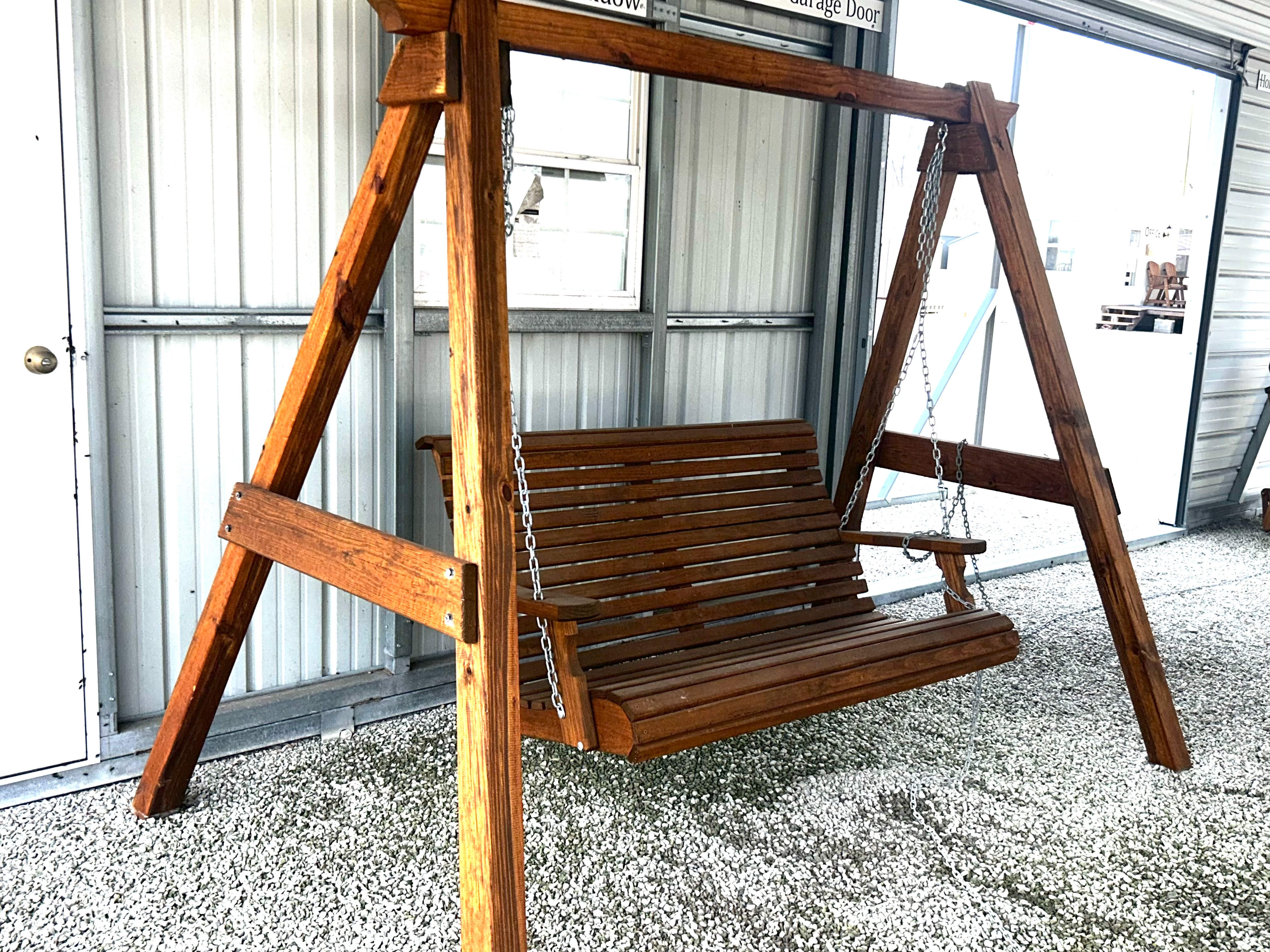 a wood stained and sealed bench attached by chains to a wooden a-frame structure in the gravel