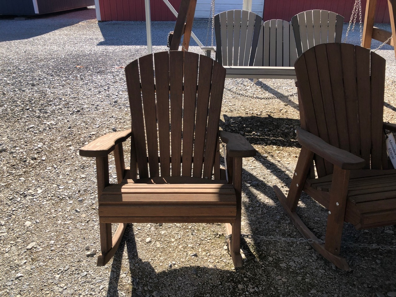 a wood rocking chair sitting in the shade. It is stained and sealed nicely. It is chained up to another chair next to it