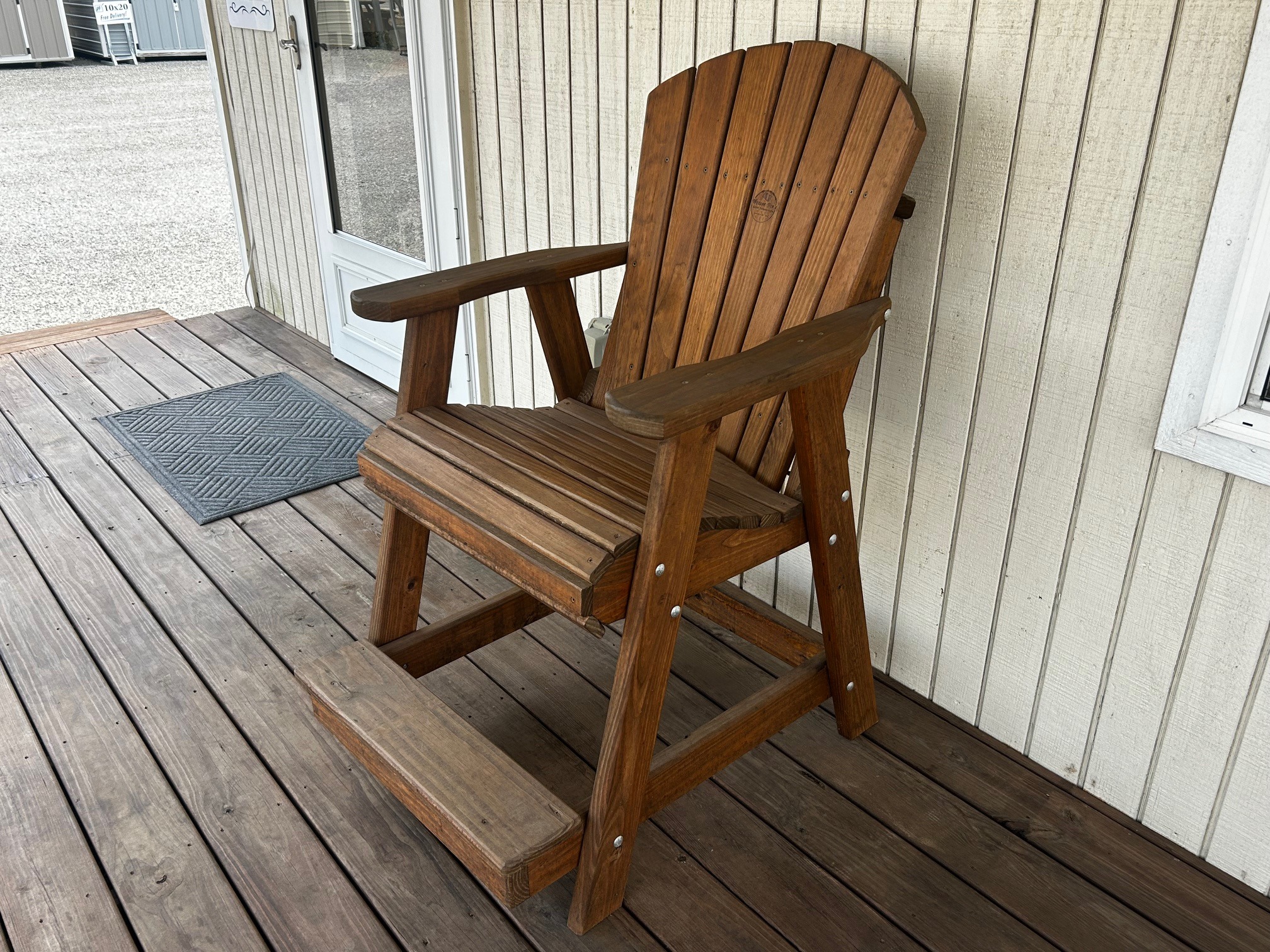 a chair sitting on a wood porch. The chair is nicely stained and sealed to last a long time