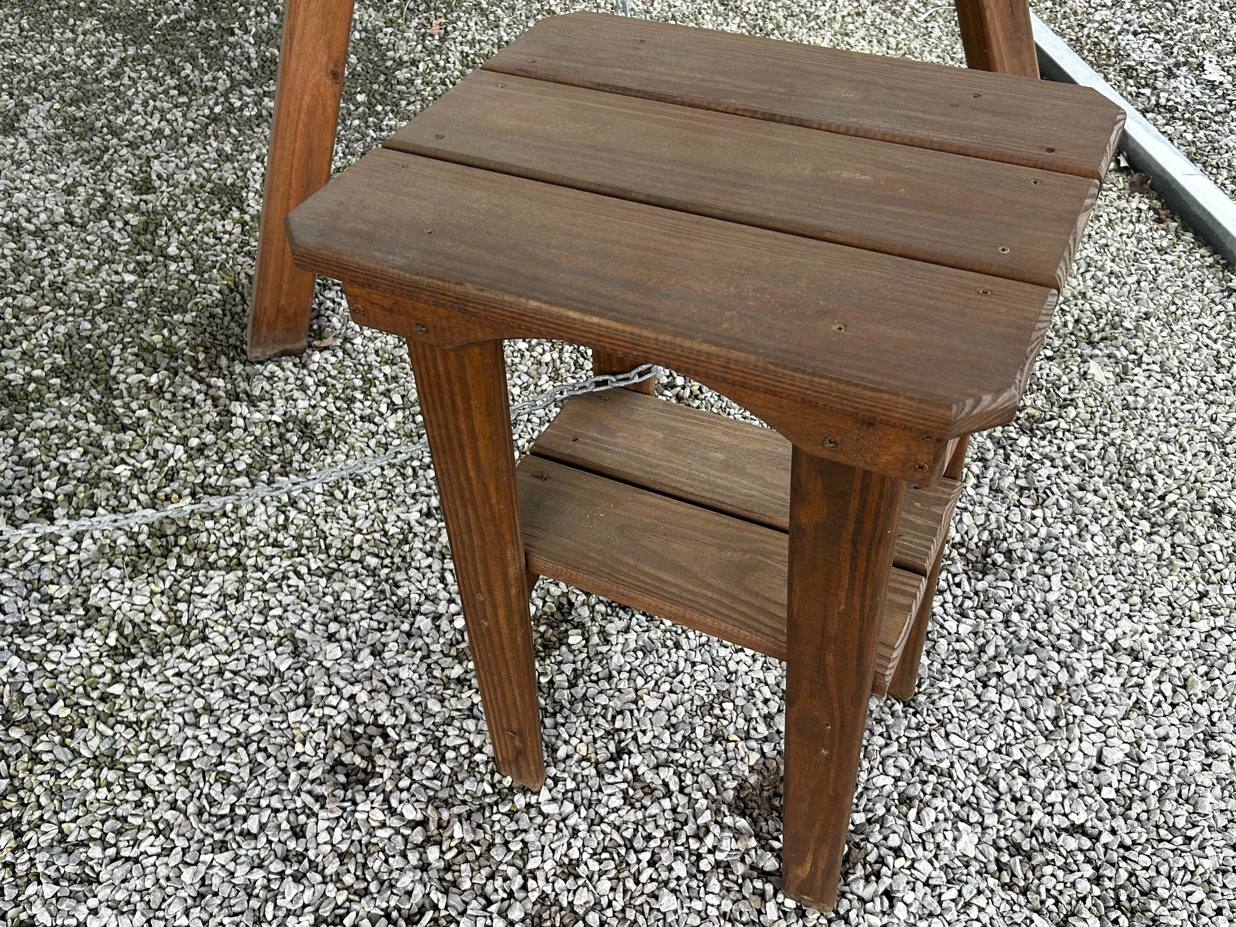 a wood table sitting in the gravel, it has a large upper tabletop and a smaller tabletop just below.