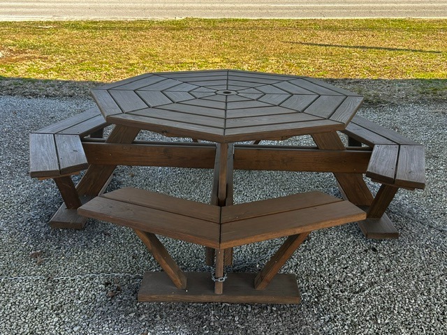 a wood stained and sealed table built in the shape of an octagon