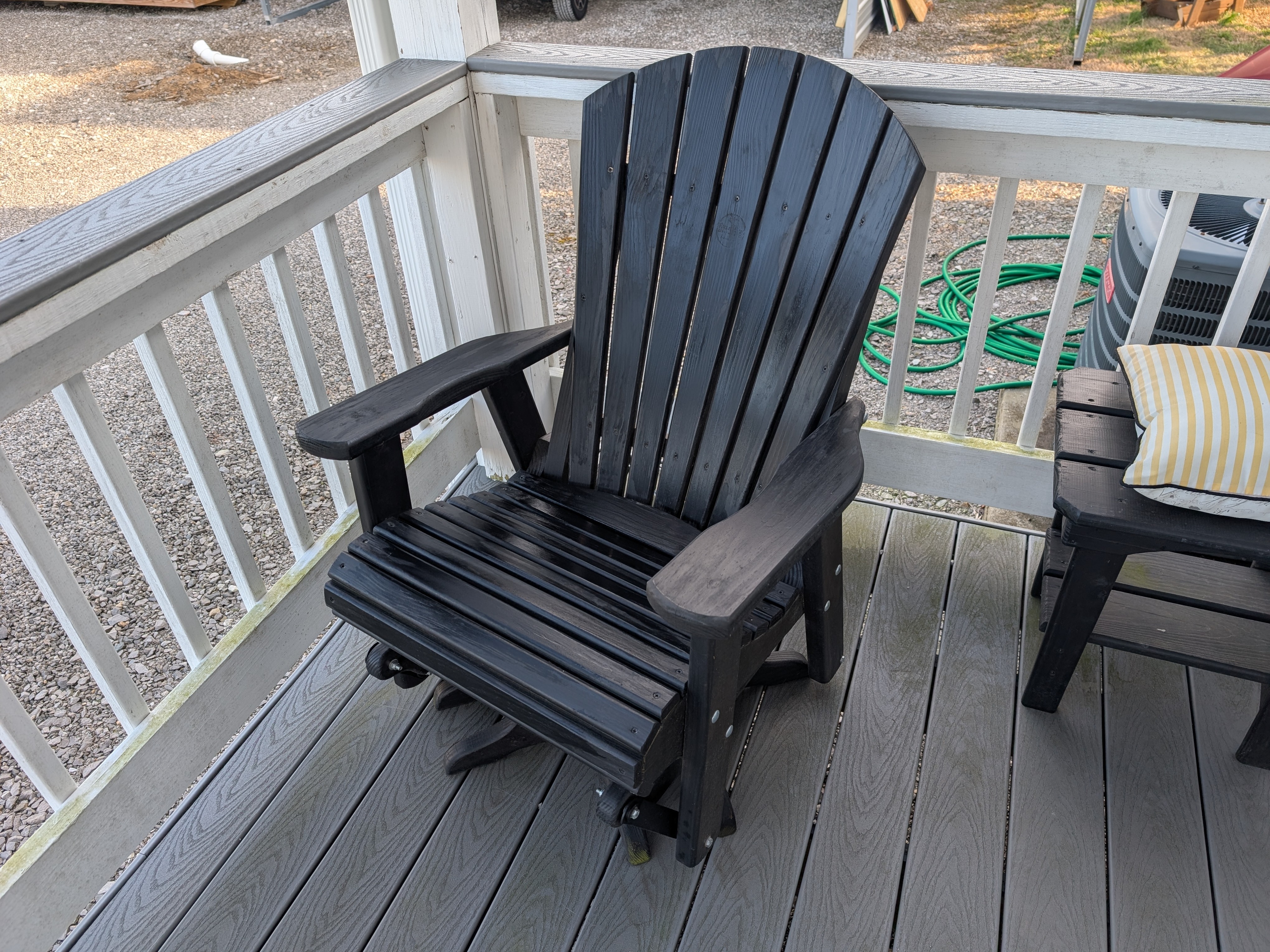 a black chair sitting on a porch. It can swivel around and glide back and forth